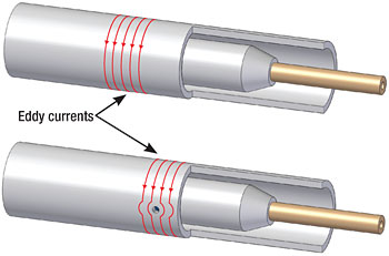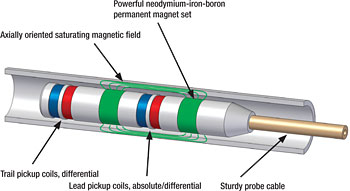 l 兩個線圈受電流激勵后在線圈周圍產生磁場。磁場穿過管件材料,在材料中產生相反的交流電。這些電流被稱作渦流。